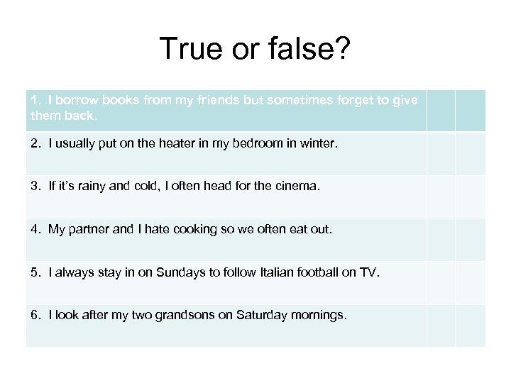 True or false? 1. I borrow books from my friends but sometimes forget to give them back. 2. I usually put on the heater in my bedroom in winter. 3. If it’s rainy and cold, I often head for the cinema. 4. My partner and I hate cooking so we often eat out. 5. I always stay in on Sundays to follow Italian football on TV. 6. I look after my two grandsons on Saturday mornings.