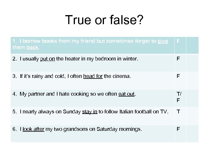True or false? 1. I borrow books from my friend but sometimes forget to give them back. F 2. I usually put on the heater in my bedroom in winter. F 3. If it’s rainy and cold, I often head for the cinema. F 4. My partner and I hate cooking so we often eat out. T/ F 5. I nearly always on Sunday stay in to follow Italian football on TV. T 6. I look after my two grandsons on Saturday mornings. F
