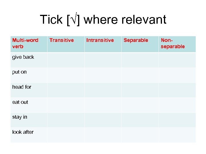 Tick [√] where relevant Multi-word verb give back put on head for eat out stay in look after Transitive Intransitive Separable Nonseparable