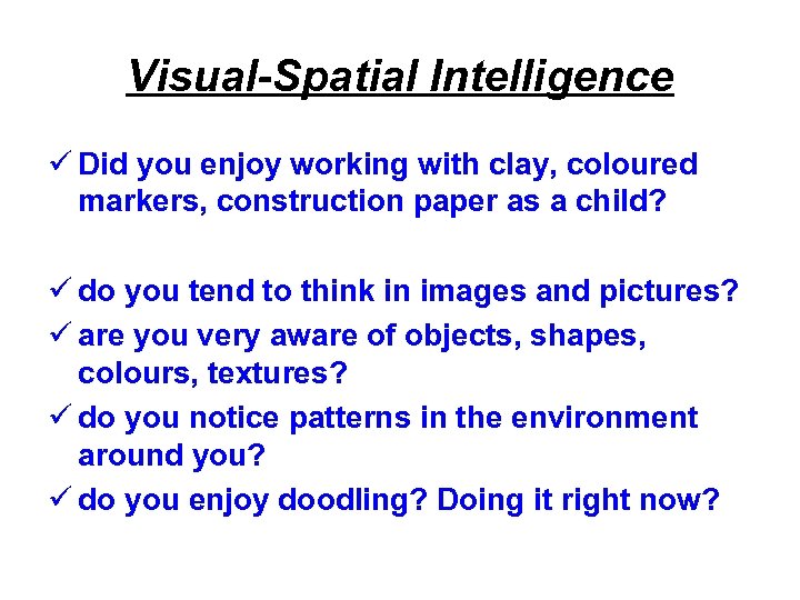 Visual-Spatial Intelligence ü Did you enjoy working with clay, coloured markers, construction paper as a child? ü do you tend to think in images and pictures? ü are you very aware of objects, shapes, colours, textures? ü do you notice patterns in the environment around you? ü do you enjoy doodling? Doing it right now?