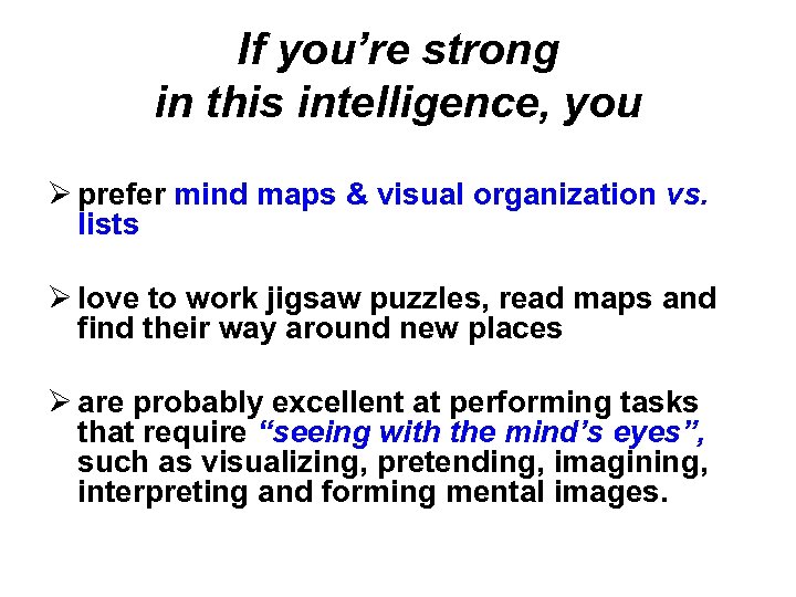 If you’re strong in this intelligence, you Ø prefer mind maps & visual organization vs. lists Ø love to work jigsaw puzzles, read maps and find their way around new places Ø are probably excellent at performing tasks that require “seeing with the mind’s eyes”, such as visualizing, pretending, imagining, interpreting and forming mental images.