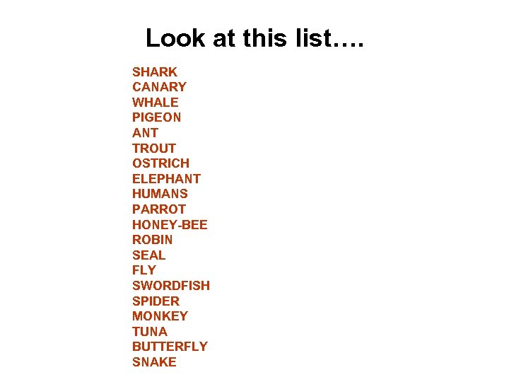 Look at this list…. SHARK CANARY WHALE PIGEON ANT TROUT OSTRICH ELEPHANT HUMANS PARROT HONEY-BEE ROBIN SEAL FLY SWORDFISH SPIDER MONKEY TUNA BUTTERFLY SNAKE