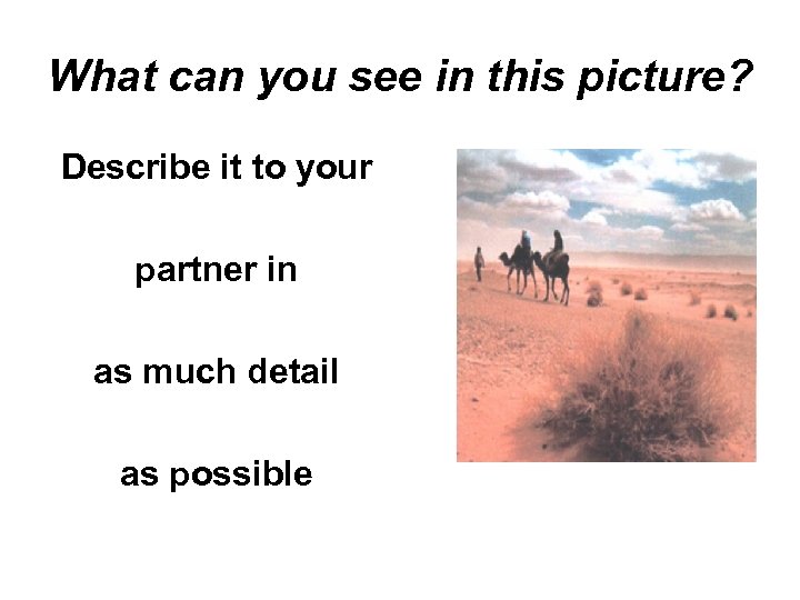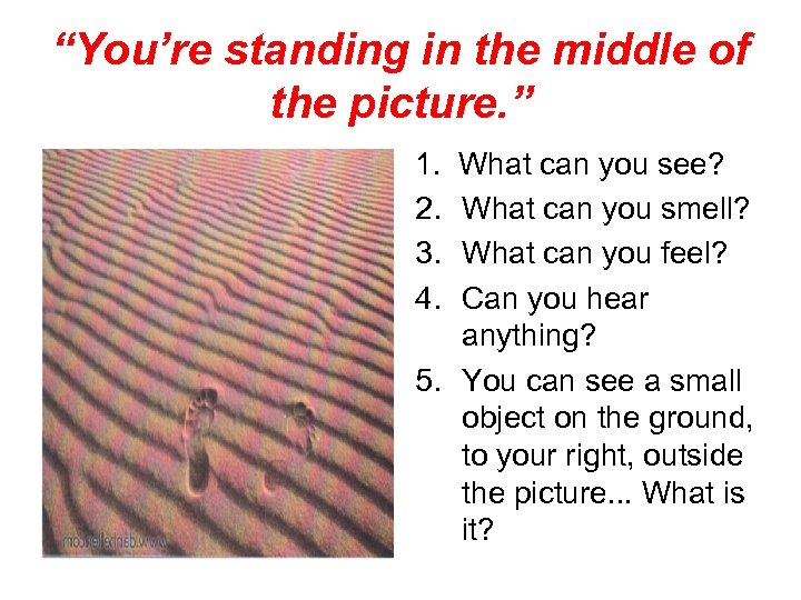 “You’re standing in the middle of the picture. ” 1. 2. 3. 4. What can you see? What can you smell? What can you feel? Can you hear anything? 5. You can see a small object on the ground, to your right, outside the picture. . . What is it?