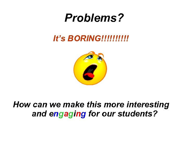 Problems? It’s BORING!!!!! How can we make this more interesting and engaging for our students?