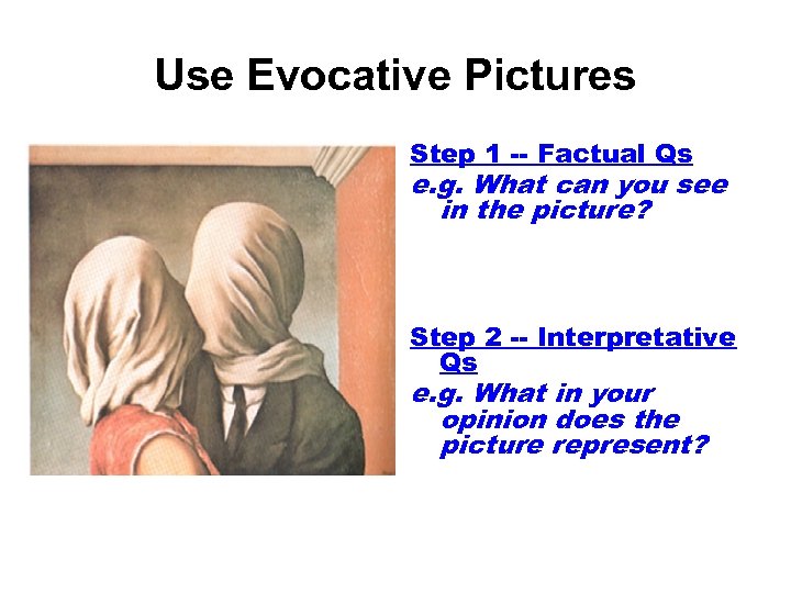 Use Evocative Pictures Step 1 -- Factual Qs e. g. What can you see in the picture? Step 2 -- Interpretative Qs e. g. What in your opinion does the picture represent?