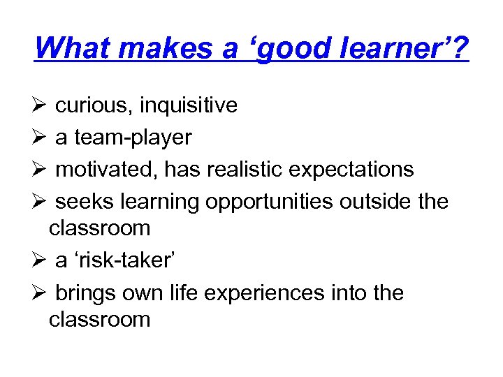 What makes a ‘good learner’? Ø Ø curious, inquisitive a team-player motivated, has realistic expectations seeks learning opportunities outside the classroom Ø a ‘risk-taker’ Ø brings own life experiences into the classroom