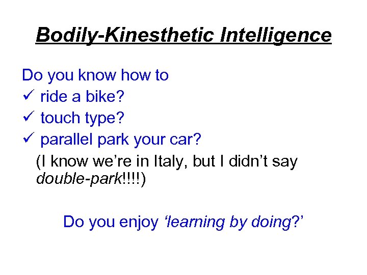 Bodily-Kinesthetic Intelligence Do you know how to ü ride a bike? ü touch type? ü parallel park your car? (I know we’re in Italy, but I didn’t say double-park!!!!) Do you enjoy ‘learning by doing? ’
