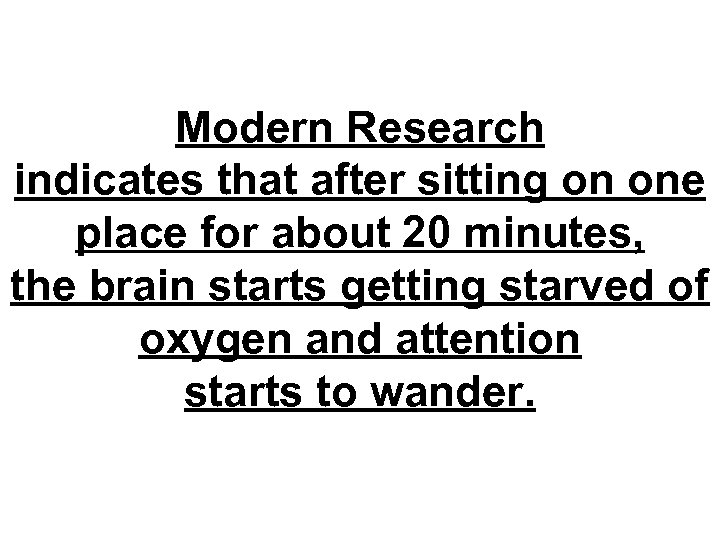 Modern Research indicates that after sitting on one place for about 20 minutes, the brain starts getting starved of oxygen and attention starts to wander.