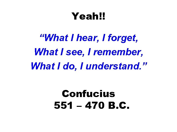 Yeah!! “What I hear, I forget, What I see, I remember, What I do, I understand. ” Confucius 551 – 470 B. C.