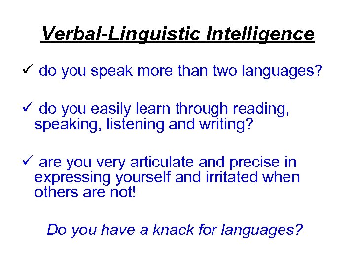 Verbal-Linguistic Intelligence ü do you speak more than two languages? ü do you easily learn through reading, speaking, listening and writing? ü are you very articulate and precise in expressing yourself and irritated when others are not! Do you have a knack for languages?