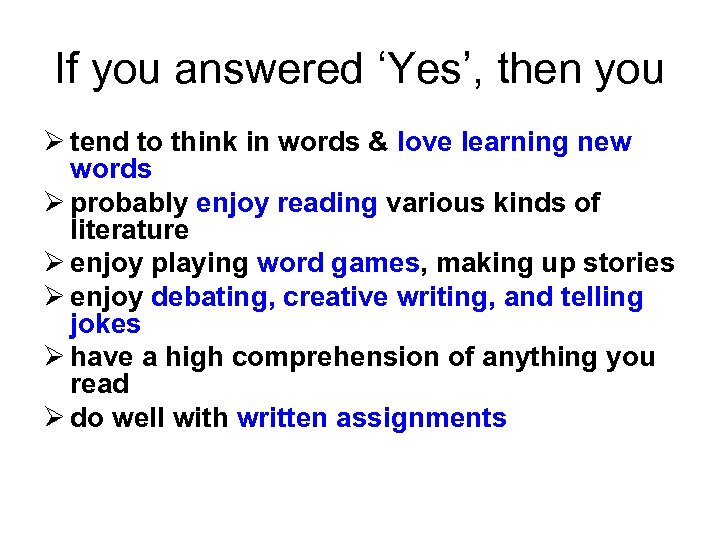 If you answered ‘Yes’, then you Ø tend to think in words & love learning new words Ø probably enjoy reading various kinds of literature Ø enjoy playing word games, making up stories Ø enjoy debating, creative writing, and telling jokes Ø have a high comprehension of anything you read Ø do well with written assignments