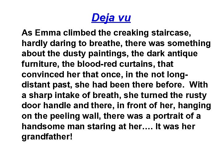 Deja vu As Emma climbed the creaking staircase, hardly daring to breathe, there was something about the dusty paintings, the dark antique furniture, the blood-red curtains, that convinced her that once, in the not longdistant past, she had been there before. With a sharp intake of breath, she turned the rusty door handle and there, in front of her, hanging on the peeling wall, there was a portrait of a handsome man staring at her…. It was her grandfather!
