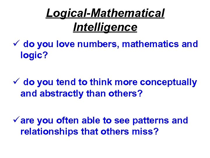 Logical-Mathematical Intelligence ü do you love numbers, mathematics and logic? ü do you tend to think more conceptually and abstractly than others? ü are you often able to see patterns and relationships that others miss?
