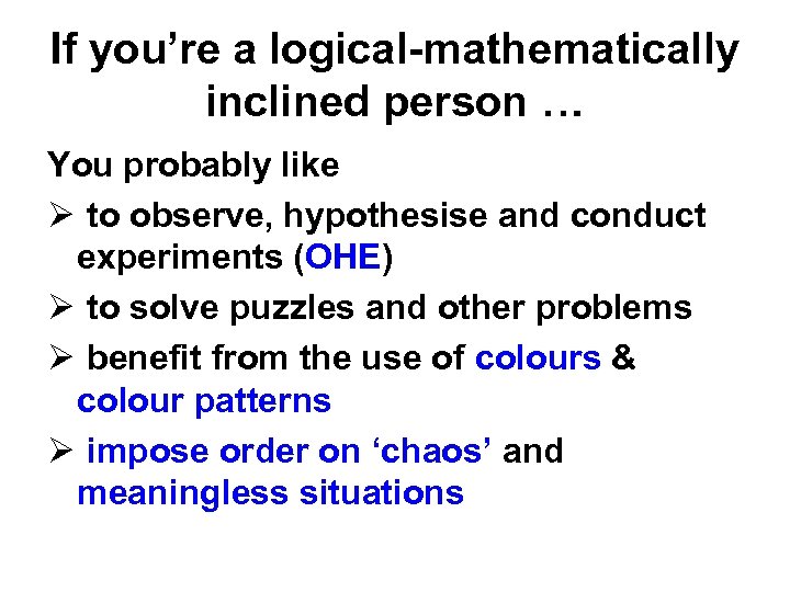 If you’re a logical-mathematically inclined person … You probably like Ø to observe, hypothesise and conduct experiments (OHE) Ø to solve puzzles and other problems Ø benefit from the use of colours & colour patterns Ø impose order on ‘chaos’ and meaningless situations