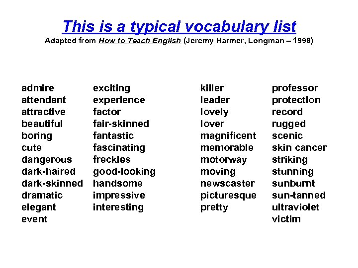 This is a typical vocabulary list Adapted from How to Teach English (Jeremy Harmer, Longman – 1998) admire attendant attractive beautiful boring cute dangerous dark-haired dark-skinned dramatic elegant event exciting experience factor fair-skinned fantastic fascinating freckles good-looking handsome impressive interesting killer leader lovely lover magnificent memorable motorway moving newscaster picturesque pretty professor protection record rugged scenic skin cancer striking stunning sunburnt sun-tanned ultraviolet victim