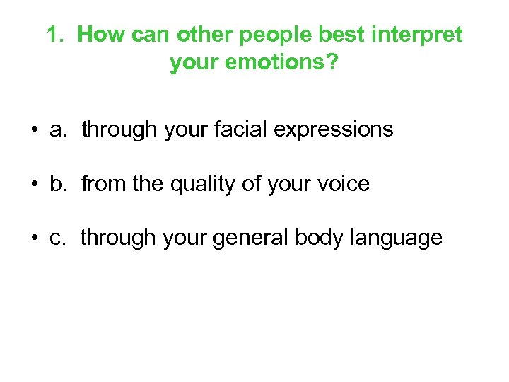 1. How can other people best interpret your emotions? • a. through your facial expressions • b. from the quality of your voice • c. through your general body language