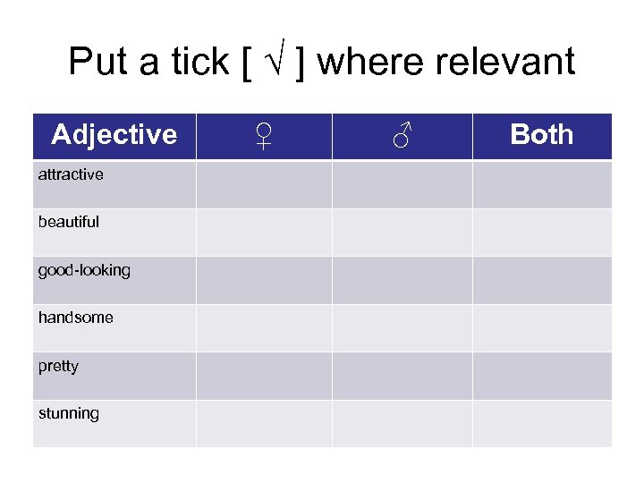 Put a tick [ √ ] where relevant Adjective attractive beautiful good-looking handsome pretty stunning ♀ ♂ Both