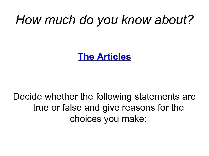 How much do you know about? The Articles Decide whether the following statements are true or false and give reasons for the choices you make:
