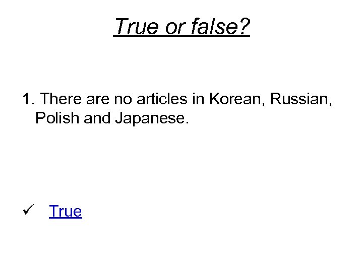True or false? 1. There are no articles in Korean, Russian, Polish and Japanese. ü True