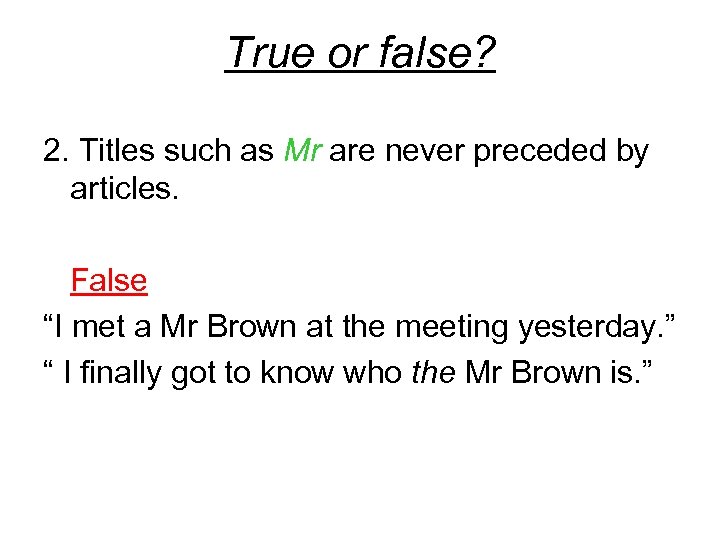 True or false? 2. Titles such as Mr are never preceded by articles. False “I met a Mr Brown at the meeting yesterday. ” “ I finally got to know who the Mr Brown is. ”