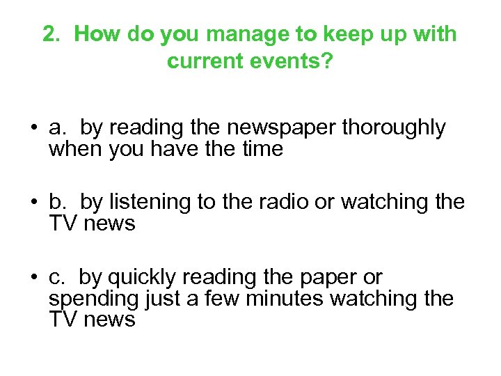 2. How do you manage to keep up with current events? • a. by reading the newspaper thoroughly when you have the time • b. by listening to the radio or watching the TV news • c. by quickly reading the paper or spending just a few minutes watching the TV news