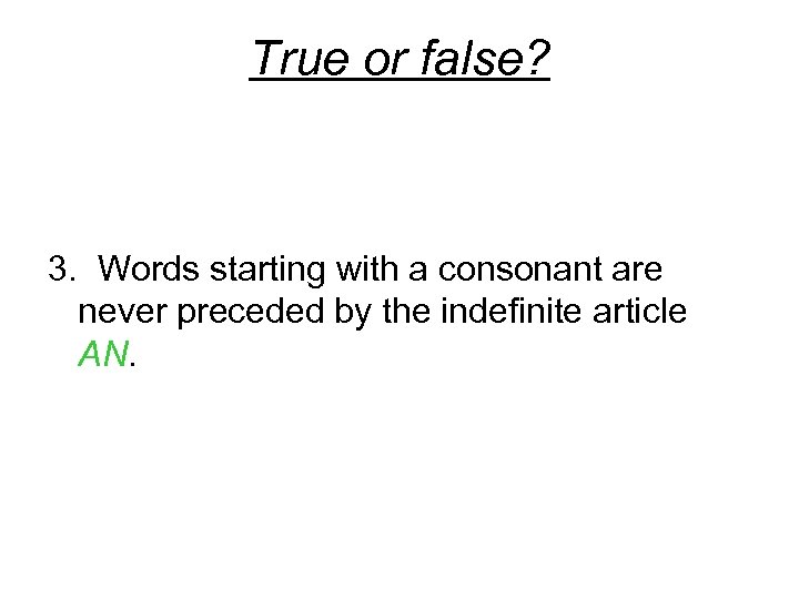 True or false? 3. Words starting with a consonant are never preceded by the indefinite article AN.
