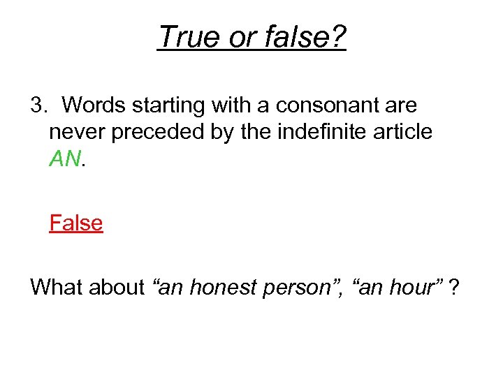 True or false? 3. Words starting with a consonant are never preceded by the indefinite article AN. False What about “an honest person”, “an hour” ?