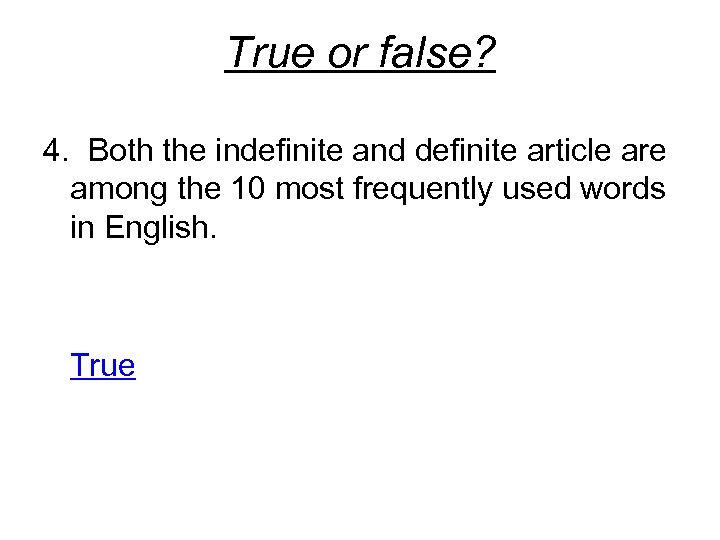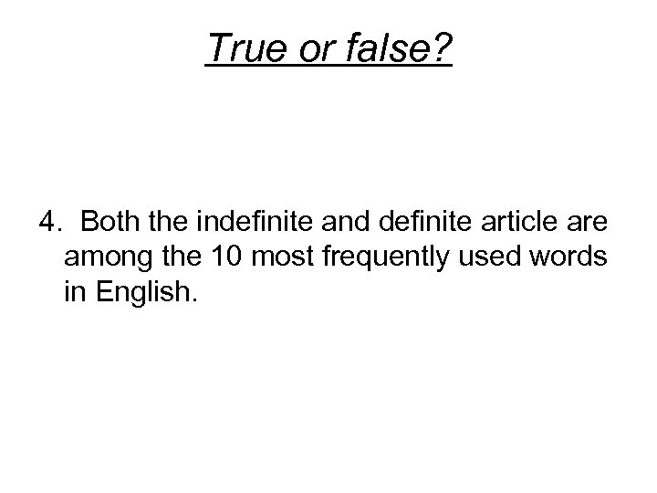 True or false? 4. Both the indefinite and definite article are among the 10 most frequently used words in English. True