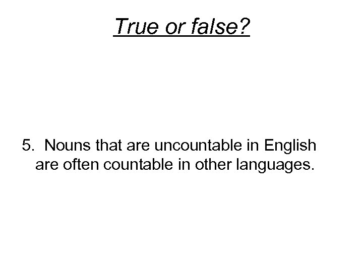 True or false? 5. Nouns that are uncountable in English are often countable in other languages.