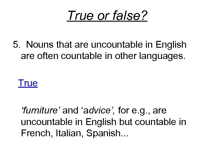 True or false? 5. Nouns that are uncountable in English are often countable in other languages. True ‘furniture’ and ‘advice’, for e. g. , are uncountable in English but countable in French, Italian, Spanish. . .