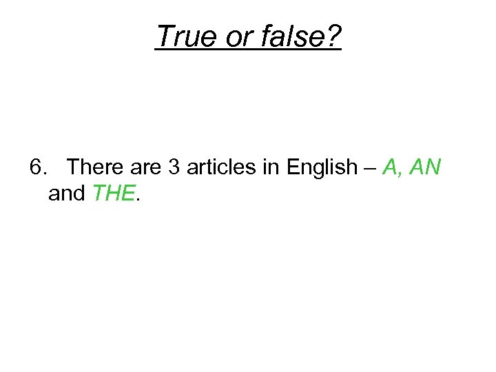 True or false? 6. There are 3 articles in English – A, AN and THE.