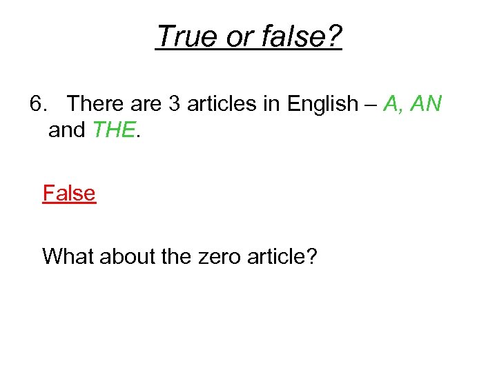 True or false? 6. There are 3 articles in English – A, AN and THE. False What about the zero article?