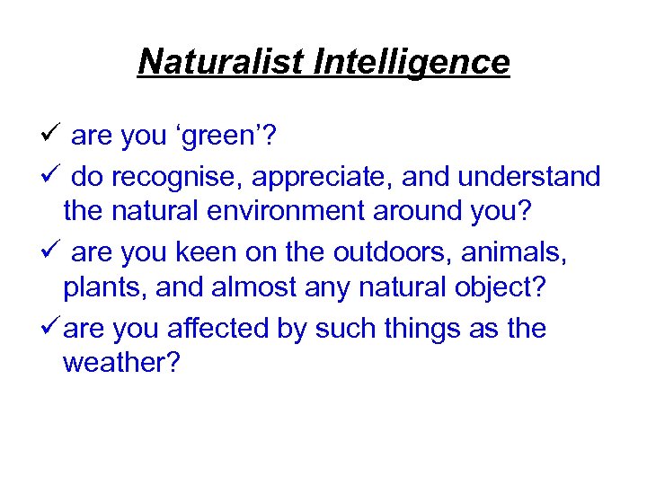 Naturalist Intelligence ü are you ‘green’? ü do recognise, appreciate, and understand the natural environment around you? ü are you keen on the outdoors, animals, plants, and almost any natural object? ü are you affected by such things as the weather?