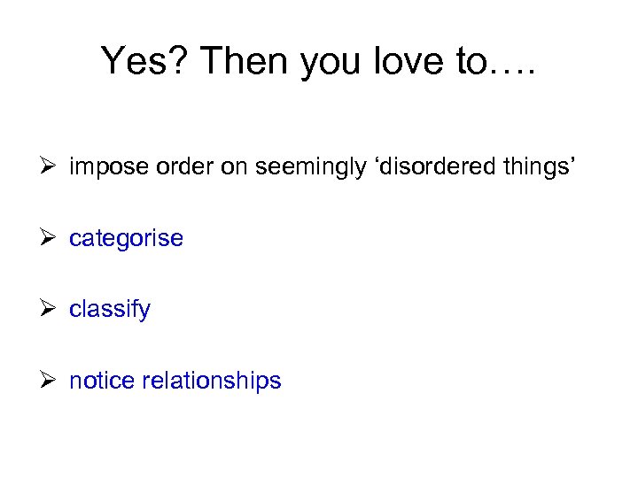 Yes? Then you love to…. Ø impose order on seemingly ‘disordered things’ Ø categorise Ø classify Ø notice relationships