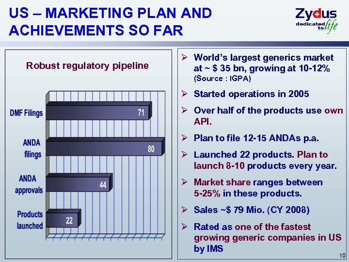 INTERNATIONAL FORMULATIONS - TWO FOLD FOCUS Developed generics markets Emerging markets • US - the largest generic market • Brazil – Nikkho (Branded), Zydus Brazil (Generics) • Zydus Pharmaceuticals USA Inc. • Europe - Zydus France SAS • Laboratories Combix, Spain • Japan • Nippon Universal Pharmaceuticals Ltd. • Asia Pacific- Sri Lanka, Myanmar, Taiwan, Philippines • Africa, Middle East – South Africa (Simayla), Sudan, Uganda, Algeria • CIS - Russia , Ukraine International sales projections Formulations-emerging markets Formulations- developed markets APIs/intermediates- exports 2007 -08 US$ 217 Mio 2010 -11 E US$ 450 Mio 9