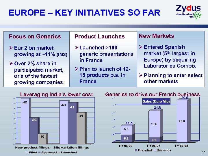 US – MARKETING PLAN AND ACHIEVEMENTS SO FAR Robust regulatory pipeline Ø World’s largest generics market at ~ $ 35 bn, growing at 10 -12% (Source : IGPA) Ø Started operations in 2005 Ø Over half of the products use own API. Ø Plan to file 12 -15 ANDAs p. a. Ø Launched 22 products. Plan to launch 8 -10 products every year. Ø Market share ranges between 5 -25% in these products. Ø Sales ~$ 79 Mio. (CY 2008) Ø Rated as one of the fastest growing generic companies in US by IMS 10