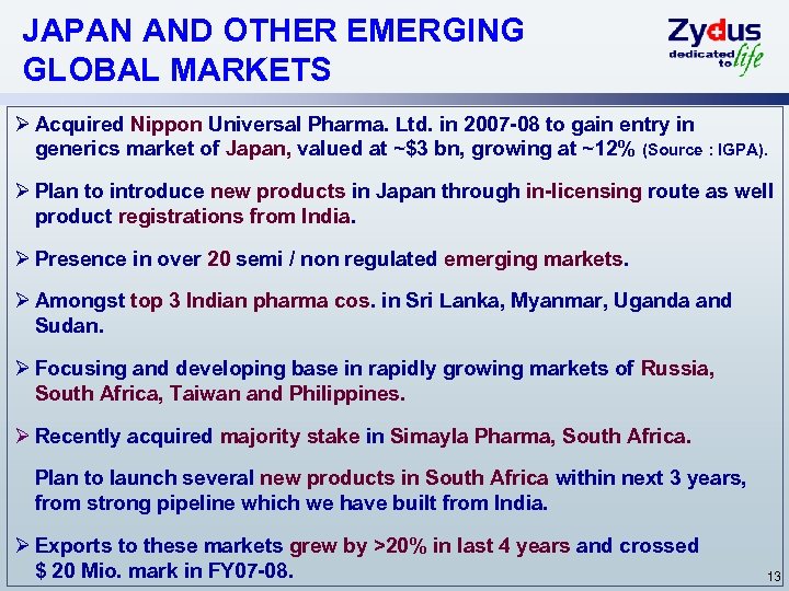 BRAZIL – KEY INITIATIVES Ø $ 10 bn pharmaceutical market, growing at ~12% (Source : IMS) Ø Entered generics market in 2005 -06 thru 100% subsidiary, Zydus Healthcare Brazil Ltda Ø Filed dossiers for 40 products so far, of which 18 have been approved and all have been launched Ø Acquired of Nikkho do Brazil Ltda. in 2007 -08 provides entry into fast growing, profitable and sustainable branded generics segment. Ø A profit-making co. , Nikkho has a mfg. facility and strong marketing and distribution network in Brazil. Ø Present basket of ~20 brands has been expanded with launch of several new brands from pipeline of existing brands and few acquired brands. Ø Crossed sales of BR 68 Mio. (~$ 35 Mio. ) in CY 2008 in Brazil, expected to grow at over 20% annually. 12
