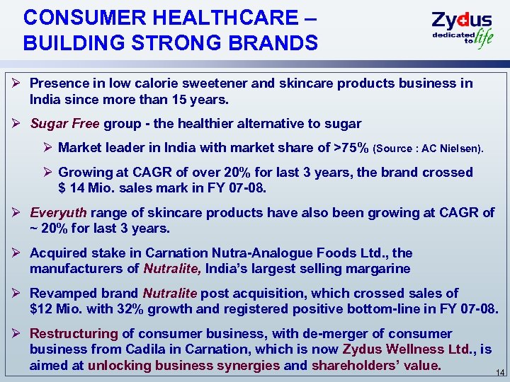 JAPAN AND OTHER EMERGING GLOBAL MARKETS Ø Acquired Nippon Universal Pharma. Ltd. in 2007 -08 to gain entry in generics market of Japan, valued at ~$3 bn, growing at ~12% (Source : IGPA). Ø Plan to introduce new products in Japan through in-licensing route as well product registrations from India. Ø Presence in over 20 semi / non regulated emerging markets. Ø Amongst top 3 Indian pharma cos. in Sri Lanka, Myanmar, Uganda and Sudan. Ø Focusing and developing base in rapidly growing markets of Russia, South Africa, Taiwan and Philippines. Ø Recently acquired majority stake in Simayla Pharma, South Africa. Plan to launch several new products in South Africa within next 3 years, from strong pipeline which we have built from India. Ø Exports to these markets grew by >20% in last 4 years and crossed $ 20 Mio. mark in FY 07 -08. 13