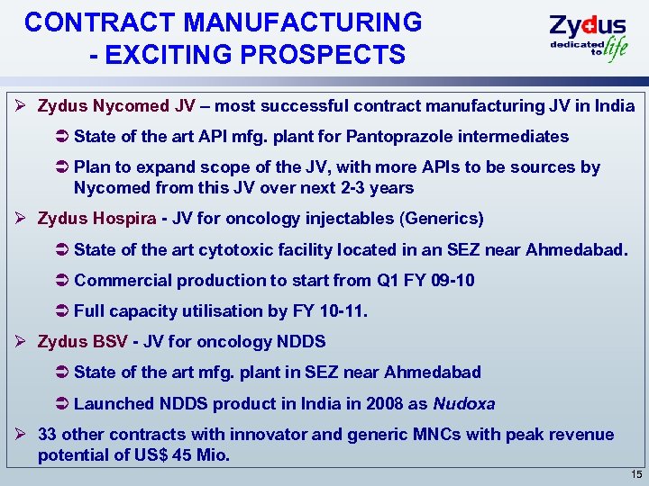 CONSUMER HEALTHCARE – BUILDING STRONG BRANDS Ø Presence in low calorie sweetener and skincare products business in India since more than 15 years. Ø Sugar Free group - the healthier alternative to sugar Ø Market leader in India with market share of >75% (Source : AC Nielsen). Ø Growing at CAGR of over 20% for last 3 years, the brand crossed $ 14 Mio. sales mark in FY 07 -08. Ø Everyuth range of skincare products have also been growing at CAGR of ~ 20% for last 3 years. Ø Acquired stake in Carnation Nutra-Analogue Foods Ltd. , the manufacturers of Nutralite, India’s largest selling margarine Ø Revamped brand Nutralite post acquisition, which crossed sales of $12 Mio. with 32% growth and registered positive bottom-line in FY 07 -08. Ø Restructuring of consumer business, with de-merger of consumer business from Cadila in Carnation, which is now Zydus Wellness Ltd. , is aimed at unlocking business synergies and shareholders’ value. 14