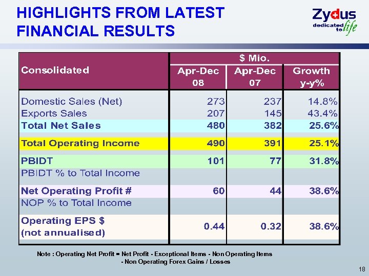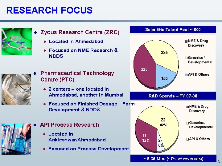 ZYDUS RESEARCH CENTER - INVESTING FOR THE FUTURE • NME Research, Biologicals (Biogenerics) & NDDS. • Therapeutic Area: Dyslipidemia, Diabetes, Obesity, Inflammation. • Infrastructure for target identification to pre-clinical research / early clinical development. • Multiple candidates under preclinical stage. NME ZYH 1 NME Pipeline Pre Clinical Dyslipidemia ZYI 1 Inflammation ZYH 2 Diabetes ZY 01 Obesity ZYH 7 Dyslipidemia ZYT 1 Dyslipidemia IND Filing Phase 1 Phase 2 Phase 3 17