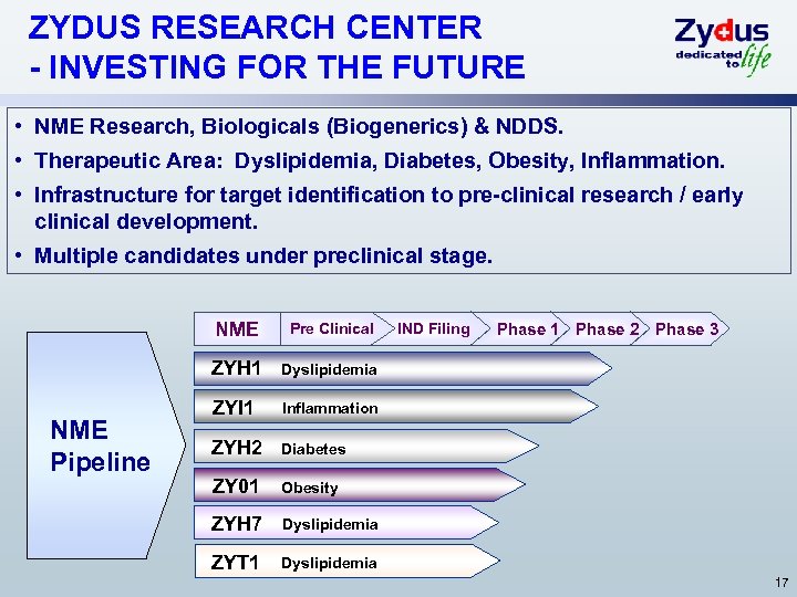 RESEARCH FOCUS l l Located in Ahmedabad l l Focused on NME Research & NDDS Pharmaceutical Technology Centre (PTC) l l l Scientific Talent Pool ~ 800 Zydus Research Centre (ZRC) 2 centers – one located in Ahmedabad, another in Mumbai Focused on Finished Dosage Development & NDDS R&D Spends – FY 07 -08 Form API Process Research l l Located in Ankleshwar/Ahmedabad Focused on Process Development 62% 32% 6% ~ $ 35 Mio. (~7% of revenues) 16