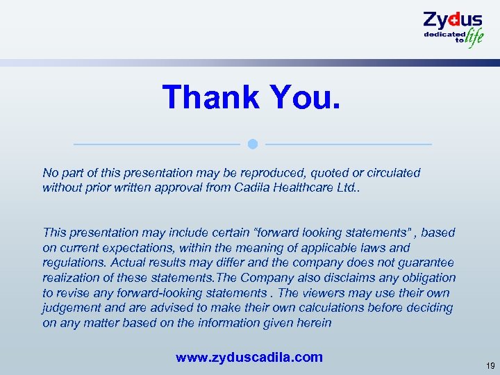 Thank You. No part of this presentation may be reproduced, quoted or circulated without prior written approval from Cadila Healthcare Ltd. . This presentation may include certain “forward looking statements” , based on current expectations, within the meaning of applicable laws and regulations. Actual results may differ and the company does not guarantee realization of these statements. The Company also disclaims any obligation to revise any forward-looking statements. The viewers may use their own judgement and are advised to make their own calculations before deciding on any matter based on the information given herein www. zyduscadila. com 19