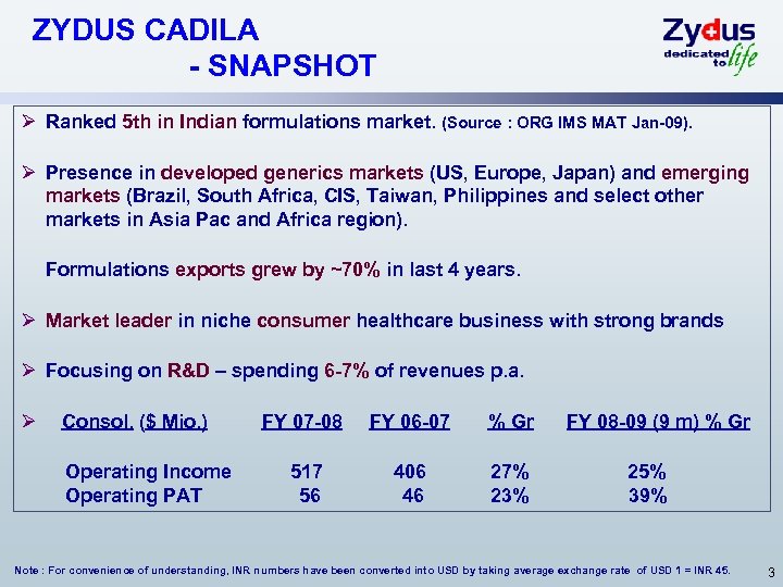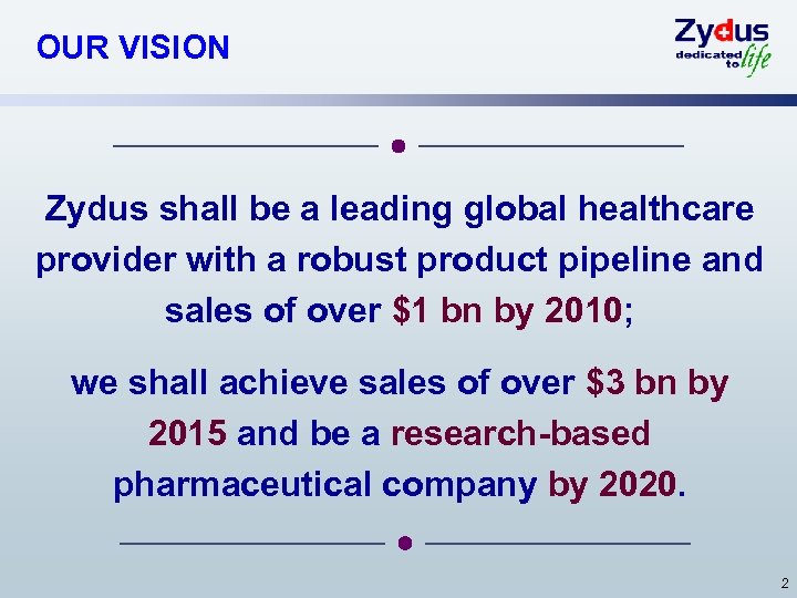 OUR VISION Zydus shall be a leading global healthcare provider with a robust product pipeline and sales of over $1 bn by 2010; we shall achieve sales of over $3 bn by 2015 and be a research-based pharmaceutical company by 2020. 2