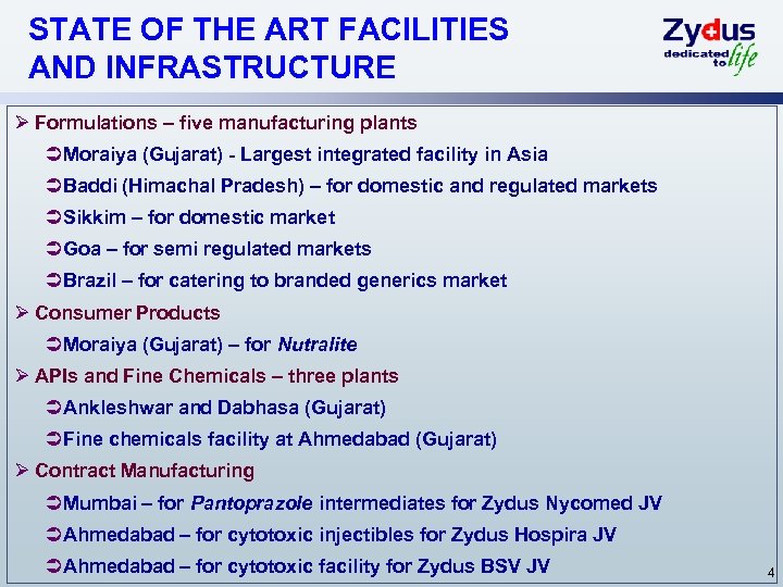 ZYDUS CADILA - SNAPSHOT Ø Ranked 5 th in Indian formulations market. (Source : ORG IMS MAT Jan-09). Ø Presence in developed generics markets (US, Europe, Japan) and emerging markets (Brazil, South Africa, CIS, Taiwan, Philippines and select other markets in Asia Pac and Africa region). Formulations exports grew by ~70% in last 4 years. Ø Market leader in niche consumer healthcare business with strong brands Ø Focusing on R&D – spending 6 -7% of revenues p. a. Ø Consol. ($ Mio. ) Operating Income Operating PAT FY 07 -08 FY 06 -07 % Gr 517 56 406 46 27% 23% FY 08 -09 (9 m) % Gr 25% 39% Note : For convenience of understanding, INR numbers have been converted into USD by taking average exchange rate of USD 1 = INR 45. 3