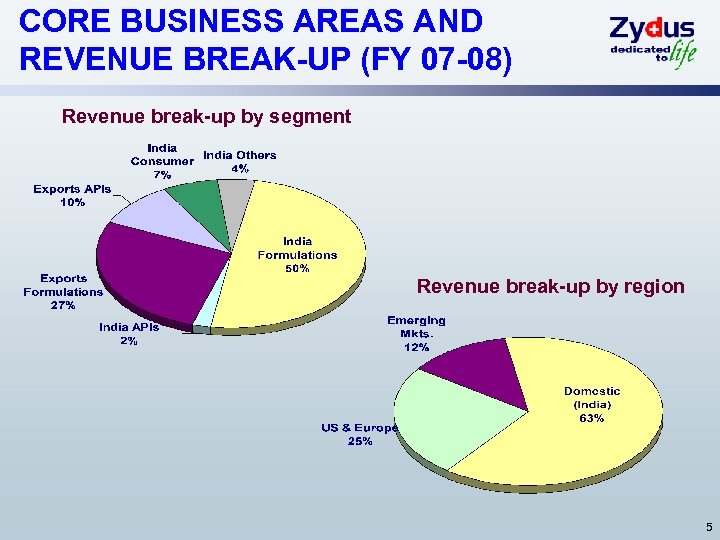 STATE OF THE ART FACILITIES AND INFRASTRUCTURE Ø Formulations – five manufacturing plants ÜMoraiya (Gujarat) - Largest integrated facility in Asia ÜBaddi (Himachal Pradesh) – for domestic and regulated markets ÜSikkim – for domestic market ÜGoa – for semi regulated markets ÜBrazil – for catering to branded generics market Ø Consumer Products ÜMoraiya (Gujarat) – for Nutralite Ø APIs and Fine Chemicals – three plants ÜAnkleshwar and Dabhasa (Gujarat) ÜFine chemicals facility at Ahmedabad (Gujarat) Ø Contract Manufacturing ÜMumbai – for Pantoprazole intermediates for Zydus Nycomed JV ÜAhmedabad – for cytotoxic injectibles for Zydus Hospira JV ÜAhmedabad – for cytotoxic facility for Zydus BSV JV 4