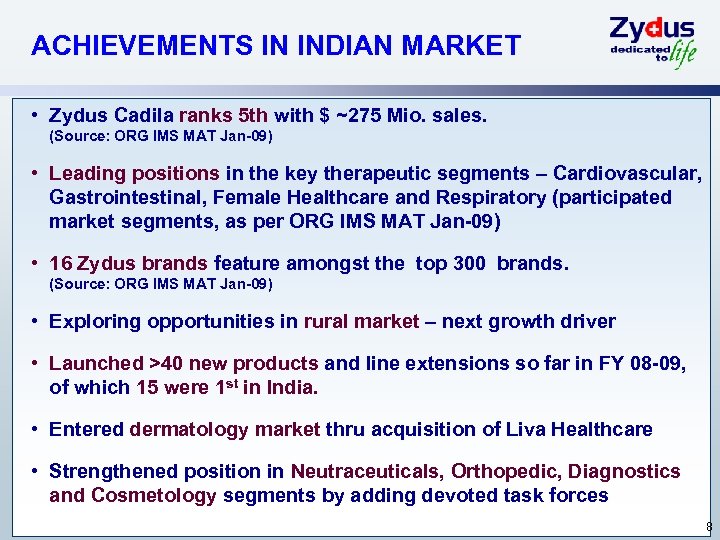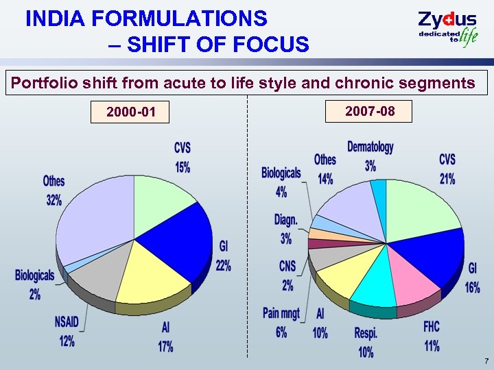 INDIA FORMULATIONS – SHIFT OF FOCUS Portfolio shift from acute to life style and chronic segments 2000 -01 2007 -08 7
