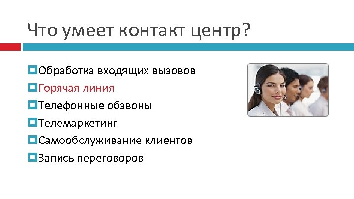 Что умеет контакт центр? Обработка входящих вызовов Горячая линия Телефонные обзвоны Телемаркетинг Самообслуживание клиентов Запись переговоров