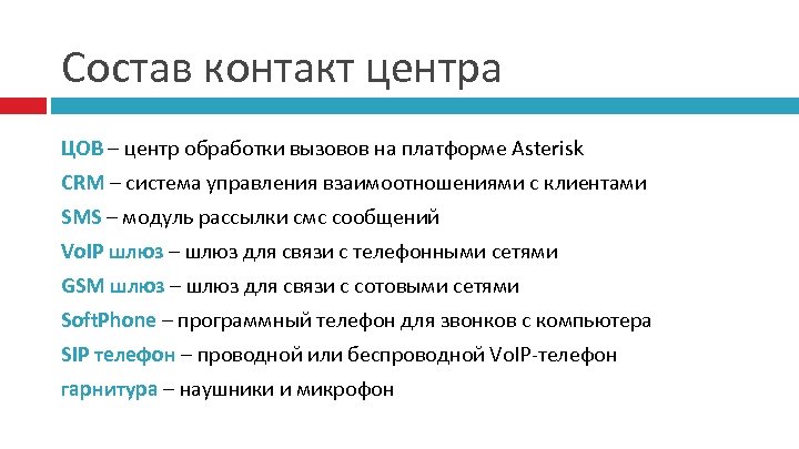 Состав контакт центра ЦОВ – центр обработки вызовов на платформе Asterisk CRM – система управления взаимоотношениями с клиентами SMS – модуль рассылки смс сообщений Vo. IP шлюз – шлюз для связи с телефонными сетями GSM шлюз – шлюз для связи с сотовыми сетями Soft. Phone – программный телефон для звонков с компьютера SIP телефон – проводной или беспроводной Vo. IP-телефон гарнитура – наушники и микрофон