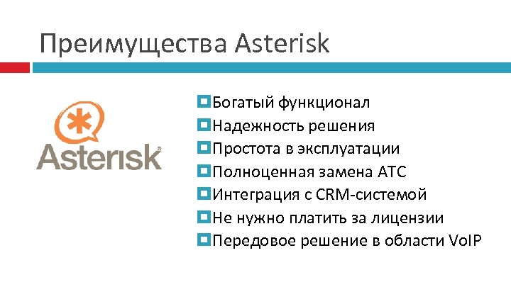 Преимущества Asterisk Богатый функционал Надежность решения Простота в эксплуатации Полноценная замена АТС Интеграция с CRM-системой Не нужно платить за лицензии Передовое решение в области Vo. IP