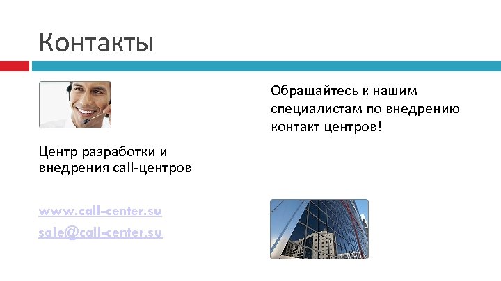 Контакты Обращайтесь к нашим специалистам по внедрению контакт центров! Центр разработки и внедрения call-центров www. call-center. su sale@call-center. su